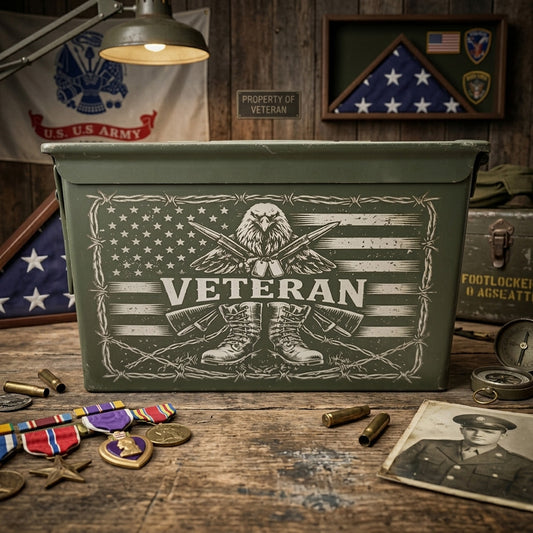 One (1) Laser Engraved "Veteran Eagle" Used Grade 1 Ammo Can - Choose from 30cal, 50 Cal or FAT 50 Cal