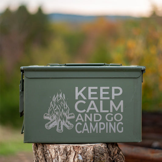 One (1) Laser Engraved "KEEP CALM AND GO CAMPING" Used Grade 1 Ammo Can with or w/o Lock Kit - Choose from 30cal, 50 Cal or FAT 50 Cal