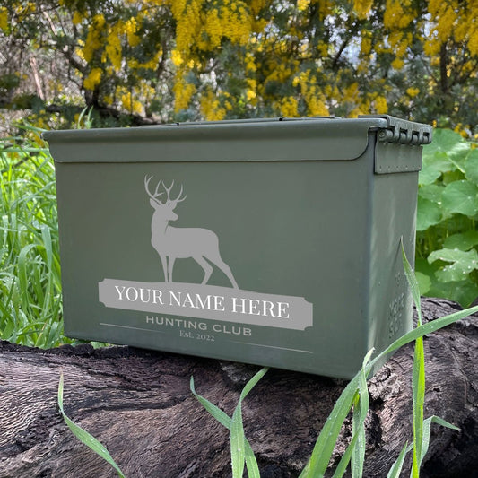 Laser Engraved - DEER HUNTING CLUB - [YOUR NAME] Used Grade 1 Ammo Cans - 30 Cal, 50 Cal or Fat 50