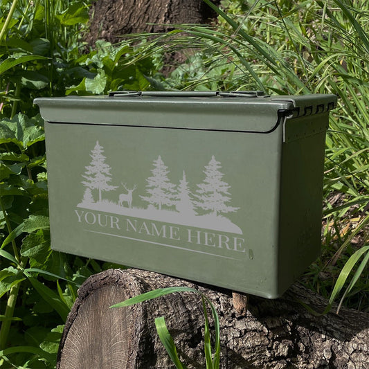 Laser Engraved - DEER LANDSCAPE - [YOUR NAME] Used Grade 1 Ammo Cans - 30 Cal, 50 Cal or Fat 50