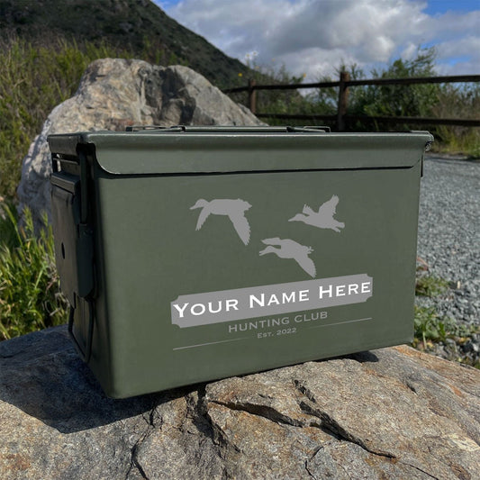 Laser Engraved - DUCK HUNTING CLUB - [YOUR NAME] Used Grade 1 Ammo Cans - 30 Cal, 50 Cal or Fat 50