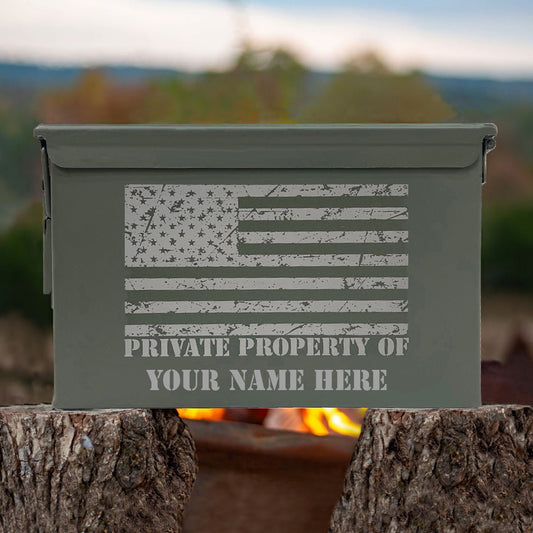 Laser Engraved - PRIVATE PROPERTY OF [YOUR NAME] - 50 Cal Used Grade 1 Ammo Can