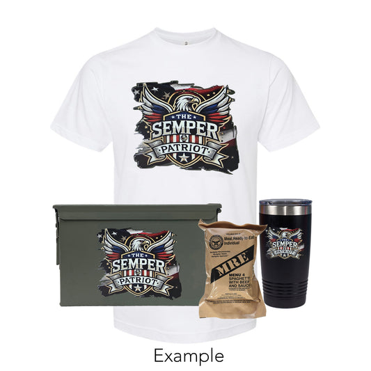 Personalized White Shirt, UV Printed Tumbler and UV Printed Ammo Can Combo. Plus as an added bonus 1 Random 2025 Mre Meal! Choose 30 Cal, 50 Cal or Fat 50 - Grade 1