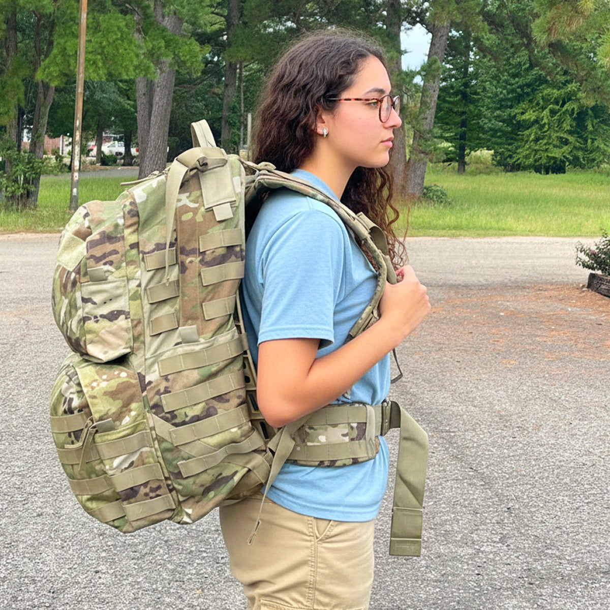 - Quick-release buckle shoulder harness & padded hip belt with PALS webbing